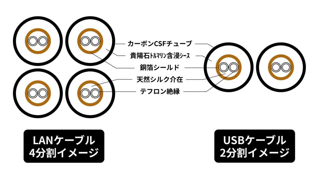 LANケーブル、USBケーブル共に2芯一対のケーブルには音色的癖がありオーディオ帯域のシールド特性の悪いアルミやマグネシウムではなく、音色的癖の発生がなくオーディオ低域のシールド特性に優れた銅箔を採用、更に外周には高周波帯域のシールド特性に優れ帯電防止効果まで発揮するカーボンCSFチューブとダブルシールド構造として、外来ノイズの飛び込みを強力に防ぎます。