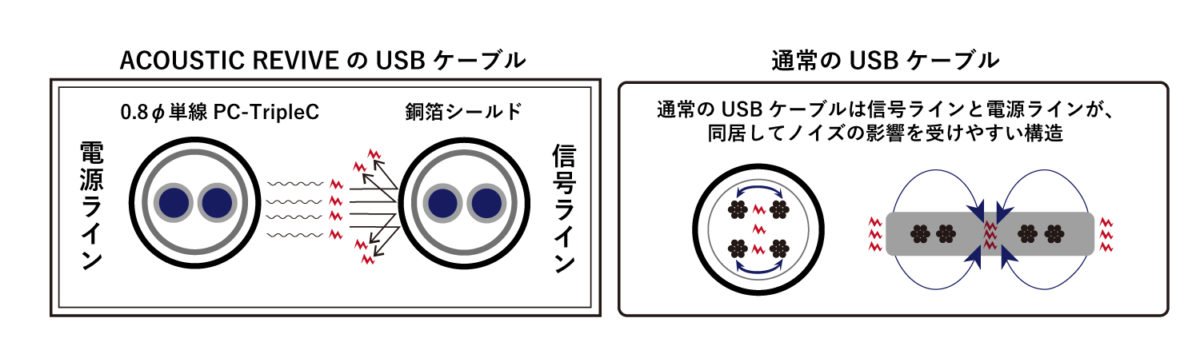 オーディオケーブルメーカーが販売しているUSBケーブルの中には、信号ラインと電源ラインを分離し、信号ラインのみシールドを施した製品もありますが、1本のケーブル内ではぞれぞれのラインが極めて接近しているため、そのシールド効果には限界があるのです。