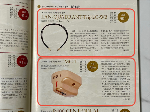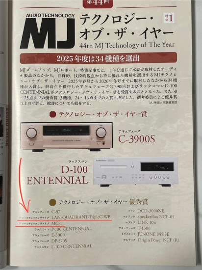 昨日来のスキャットさん既報の通り、ACOUSTIC REVIVEの2つの商品、MCカートリッジMC-1とLANケーブルLAN-QUADRANT-TripleC-WBがMJ(無線と実験 2026.1 冬号)誌「第44回MJテクノロジー・オブ・ザ・イヤー」の優秀賞に選出されました。 . ![]() 本日我が家にも当該のMJ誌が到着しました。 今回の選考から変わった特別なことは、従来の「カートリッジ部門」とか「パワーアンプ部門」とかの中から部門賞を決める方式をやめて、ジャンルの垣根を超えた全体での得票総数から選出された純粋に実力ある新製品が選ばれていることです。 純広告貢献度を度外視した広告主メーカーへの忖度を抜きにした真っ当な選出の中で「優れた製品」を選出しています。 ・・・つまり、ACOUSTIC REVIVEのケーブルやアクセサリーやカートリッジは「付属するモノ」ではなく、アンプやプレーヤーやスピーカーと同等の れっきとした「回路」であり「コンポーネント」であるということの証でもあります。 . ![]() . ![]() . ![]() 選出理由は画像の文章に記された内容の通り。 僕もユーザーであるTIDAL聴取には絶対になくてはならないLAN-TripleC-WBも選出。 各デモイベントで同価格帯の競合カートリッジより別次元のパフォーマンスを実演しオーディエンスに驚きと歓喜で迎えられたMC-1も受賞。 . ![]() 巻頭の「ZOOM UP」のコーナーにもMC-1の詳細リポートが書かれてあります。 ACOUSTIC REVIVEファンの僕にとってもこの上ない喜びです。 自分が信じ全幅の信頼を置く製品が選出されお墨付きをいただけることは ユーザーとしても最大の“ギフト”であり”勲章”です。 改めまして、本当に本当にこのW受賞を心から祝福します。 |