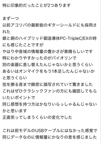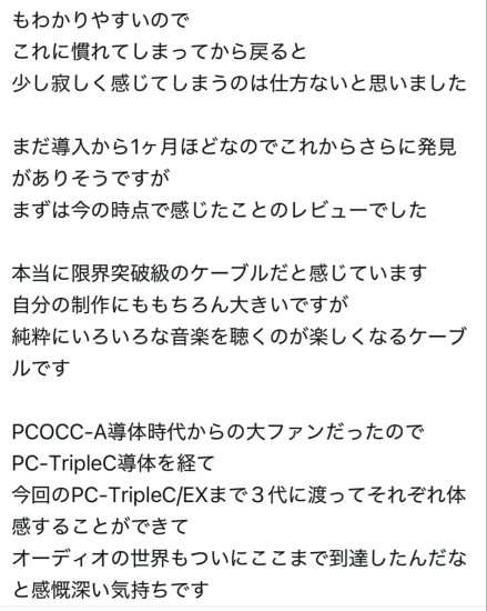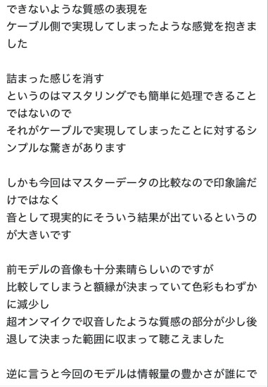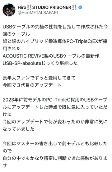 スキャットです。 エンジニアHIROさんがSNSで USB-SP-absolute のレビューをあげて下さっていましたので ご紹介いたします。 なんと世界限定1500メートル! USBケーブルでSPで使えば2m使用。 LAN-QUADRANT-absolute なら4分割なので4m使用 あっという間に終了ってことになるかもしれません。 デモでabsoluteの音を聴き、次元が違う高音質! QOBUZ、TIDAL、ストリーミングやダウンロードハイレゾ音源が別次元になります うちのシステムがこれ程まで良い音が出るんだ! 拙宅はDACに入れるUSB-PL-absolute を導入する予定です。 早く予約しないと販売終了になりそう ************************************** エンジニアHiroさんによるUSB-SP-absoluteのレビューになります。 中音域の情報量の豊かさ、額縁が大きくなったような開放感、奥行きや立体感の向上等、効果を完璧に聴き取って頂き有難い限りです。 ケーブル間の干渉の回避と伝導率105%のPC-TripleC/EX導体の採用はUSBとLAN伝送の概念を覆します。 ネットワークオーディオにおいていまだに一般のOA用USBケーブルやLANケーブルを使用している方が見受けられます。 またオーディオグレードを謳いながらOA用と大差ない素材や構造のUSBケーブルやLANケーブルも存在します。 高額なネットワークプレーヤーやネットワークPC.スイッチングハブ、光アイソレーターを使用しても従来の素材や構造のUSBケーブルやLANケーブルを使用しているのは本末転倒でありハイクオリティなネットワークオーディオ再生は不可能だと断言させて頂きます。 分離構造によるジッター低減とPC-TripleC/EX導体による究極の導通特性を実現したUSB-SP&PL-absoluteとLAN-QUADRANT-absoluteは世界限定1500m発売です。 残り少なくなって参りましたのでご注文はお早めにお願い致します。 [ ![]() ![]() ![]() ![]() ![]() ![]() ![]() |