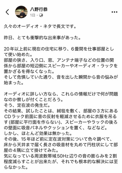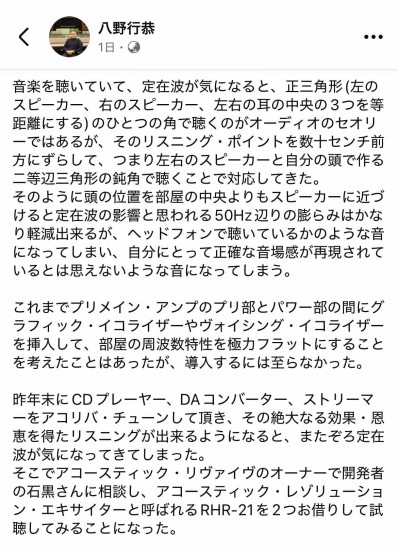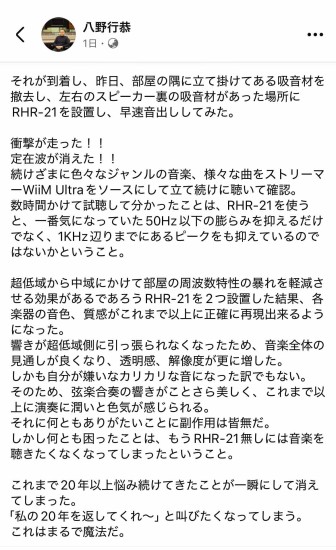 こんにちは。 スキャットです。 さだまさしさんの音楽プロデューサー・ディレクターで有名な八野行恭(はちの ゆきやす) さんがRHR 21のレビューをあげて下さいましたのでシェアさせていただきます! ************************************* 音楽プロデューサー・編曲家の八野行恭さんによるRHR-21(レンコン)のレポートになります。 長年音楽制作の現場に従事されオーディオにも取り組まれて来たプロならではの具体的で説得力ある内容となっておりますのでぜひご参照下さい。 長年悩まされて来た定在波が一瞬で解決したくだりは必読です! ![]() ![]() ![]() |